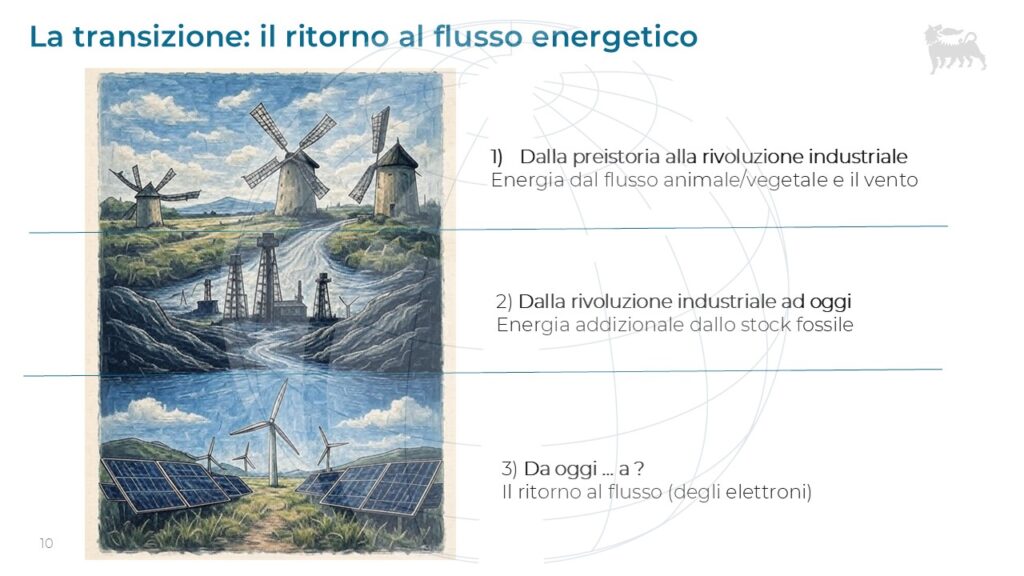 Per millenni l’umanità ha tratto energia dal flusso naturale — animali, vento, biomassa. Con la rivoluzione industriale ha imparato a estrarre energia dallo stock fossile, accumulato nel sottosuolo per milioni di anni.