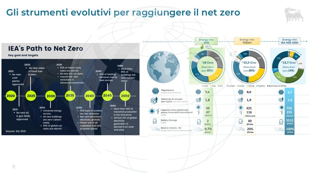 Richiamando i principali scenari elaborati dall’Agenzia Internazionale dell’Energia (NZE 2021–2023), Gattei ha ricordato che l’obiettivo globale di raggiungere emissioni nette zero entro il 2050 implica una profonda trasformazione dei sistemi energetici mondiali.
