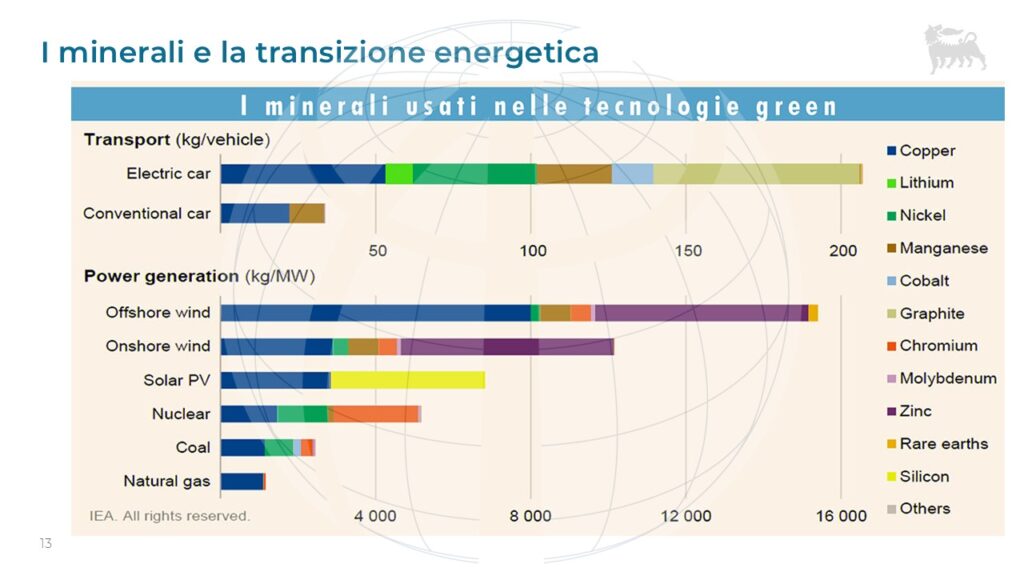 Le tecnologie rinnovabili e le infrastrutture per la decarbonizzazione — dai pannelli fotovoltaici ai veicoli elettrici, dalle batterie agli elettrolizzatori per l’idrogeno — richiedono quantità crescenti di minerali strategici: litio, rame, nichel, cobalto, terre rare, gallio, germanio, vanadio, platinoidi, e molti altri.