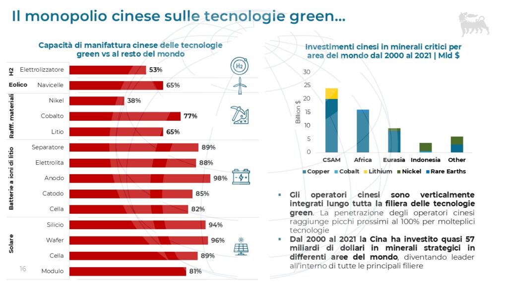 Gattei ha illustrato dati che evidenziano una penetrazione quasi totale degli operatori cinesi lungo l’intera filiera delle tecnologie green: estrazione, raffinazione, componentistica e manifattura.